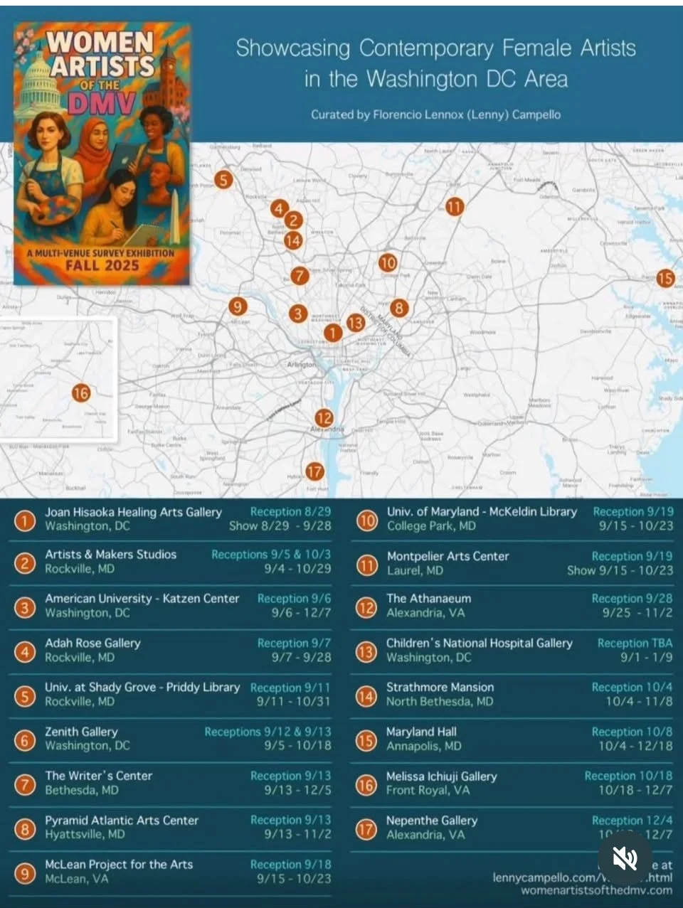 Women Artists of the DMV is the first large-scale curated exhibition dedicated to showcasing the work of active female visual artists from the region. Featuring more than 400 artists, it is one of the largest curated fine art exhibitions in the United States. The show will run from September through December 2025 across seventeen venues in Washington, DC, Maryland, and Virginia: